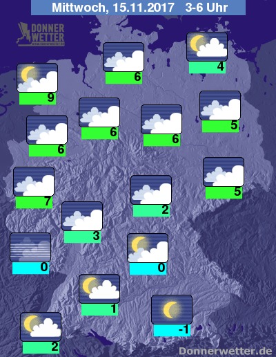 In der folgenden Nacht klingen die Niederschläge über der Nordhälfte Deutschlands weitgehend ab, jedoch bleibt es bei der meist dichten Bewölkung. Über dem Süden ist es hingegen verbreitet locker bewölkt oder sternenklar, dazu bleibt es trocken. Die Temperatur sinkt auf 9 Grad in Emden und bis -1 Grad in Rosenheim.