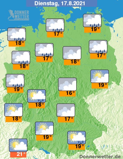 Heute Abend ist es weiterhin oft dicht bewölkt, hier und da zeigen sich Aufheiterungen. Vielerorts bilden sich Schauer oder es fällt zeitweise Regen. Die Temperatur liegt bei 17 Grad im Norddeutschen Tiefland und bis 27 Grad in Dresden. Im Nordwesten weht ein oft starker, an der Nordsee verbreitet stürmischer Wind.