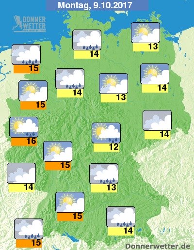Am Montag ist es vom Nordosten bis in den Osten hinein meist wechselnd bis aufgelockert bewölkt und trocken, sonst ist es teils stark, teils aufgelockert bewölkt und es bilden sich gebietsweise Schauer. Die Temperatur erreicht 12 Grad im Grabfeld und bis 16 Grad im Rheinland.