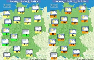 Stand Donnerstag Nachmittag sieht es so aus, dass in der Nacht zum Samstag von Westen her Tiefausläufer mit Regen über das Land hinweg ziehen. Auch am Samstag Vormittag kann es es noch Regen geben, am Nachmittag sieht es trockener und freundlicher aus. Die Temperaturen erreichen im Norden um 15 Grad, im Südwesten um 18 Grad.