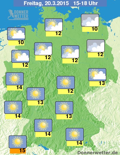 Heute Nachmittag scheint in der Südhälfte Deutschlands verbreitet die Sonne und es ziehen kaum Wolken durch. Nach Norden hin ziehen jedoch zunehmend mehr Wolken durch und besondes im äußeren Norden sind sie auch gebietsweise dicht, dabei bleibt es aber trocken. Die Temperatur liegt bei 10 Grad in Rostock und um 15 Grad im Breisgau.