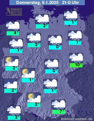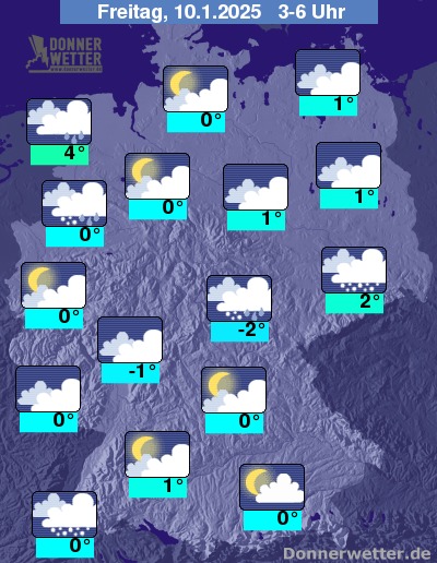 In der Nacht zum Freitag fällt an den Alpen noch anhaltend Schnee; sonst ziehen die Niederschlagsgebiete im Nachtverlauf ostwärts ab, nachfolgend lockert es gebietsweise auch auf und es sind nur noch selten Schauer zu erwarten.