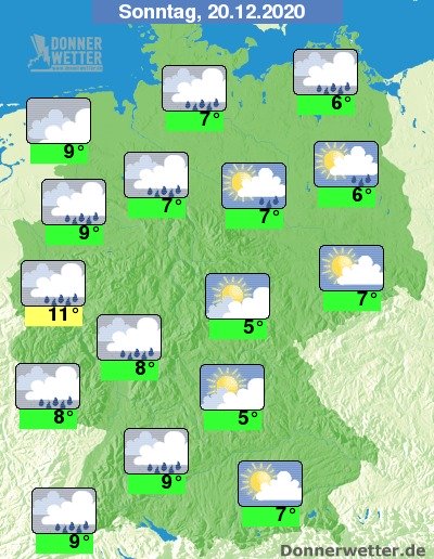 Am Sonntag im Osten und Südosten ist es zum Teil heiter, sonst ziehen aber überwiegend dichte Wolken durch, dabei fällt in einem Streifen von Südwest- bis Nordostdeutschland gebietsweise Regen, sonst bleibt es hingegen weitgehend trocken. Die Temperatur steigt auf 5 Grad im Grabfeld und bis 11 Grad in der Kölner Bucht.