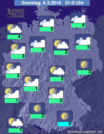 In der Nacht zum Montag ist es im Süden meist locker oder aufgelockert bewölkt und mehrheitlich trocken, vor allem in der Landesmitte fällt unter dichten Wolken jedoch gebietsweise Schnee oder Schneeregen, dabei besteht Glättegefahr! Im Osten und Nordosten ist es meist locker bewölkt, teils sternenklar und trocken. Im übrigen Bundesgebiet ziehen oft viele und teils dichte Wolken durch, dazu bleibt es aber meist trocken. Die Temperatur sinkt auf 2 Grad an der Nordsee und bis auf -2 Grad im Breisgau.