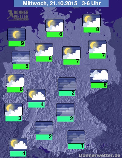 In der Nacht zum Mittwoch klingen die Niederschläge verbreitet ab, vor allem im Osten Deutschlands fällt jedoch zeitweise Regen. Die Bewölkung lockert ansonsten aber häufig auf und besonders über dem Süden, der Landesmitte und im Nordwesten zeigt sich der Himmel oft auch sternenklar. Die Tiefstwerte liegen bei 9 Grad an der Nordsee und bis etwa 1 Grad in München. Es bildet sich gebietsweise Nebel oder Hochnebel. Dabei ist auch Glätte durch überfrierende Nässe oder Rauhreif möglich!