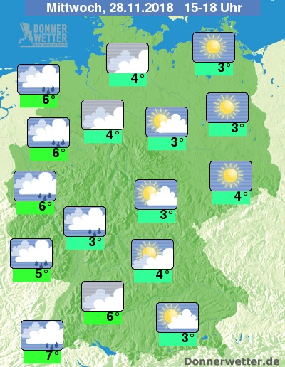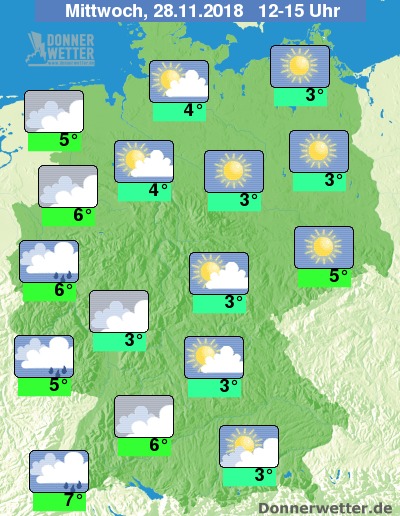 Im Laufe des Nachmittags breitet sich der Regen im Westen etwas aus und erreicht auch das westliche Niedersachsen, sowie das Rhein - Main - Gebiet. Sonst gibt es eine Mischung aus Wolken und etwas Sonne. Am freundlichsten bleibt es vermutlich im Nordosten.