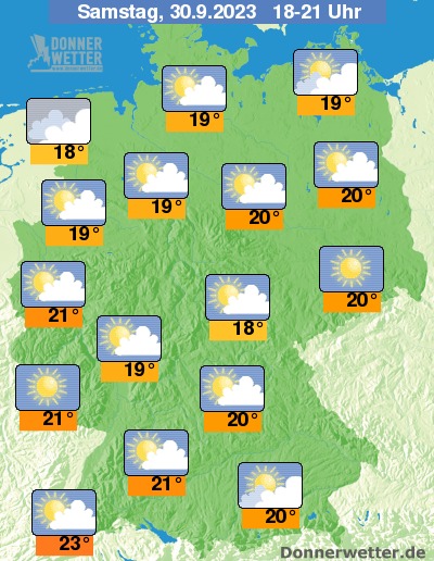 Heute Abend ziehen rund um die Nordsee oft kompakte Wolken auf, es bleibt aber weitgehend trocken. Im großes Rest der Republik ist es meist heiter bis sonng und es bleibt trocken. Die Temperatur liegt bei 18 Grad in Jena und 23 Grad in Freiburg.