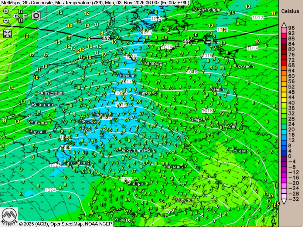 Die Strömungs- und Temperartur- sowie die Wetter- / Bewölkungskarte für Montagfrüh nach GFS: