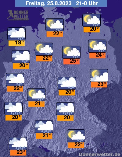 Auch am späten Abend begleitet uns wechselnde oder starke Bewölkung, dabei ist weiterhin immer wieder mit Schauern und lokalen Gewittern zu rechnen.