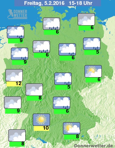 Heute Nachmittag ist es im Süden oft heiter oder sonnig, dazu bleibt es auch weitgehend trocken. Im übrigen Bundesgebiet ziehen dagegen weitgehend dichte Wolken durch und es fällt zeitweise Regen. Die Temperatur steigt auf 5 Grad an der Müritz und bis 12 Grad in Bonn.