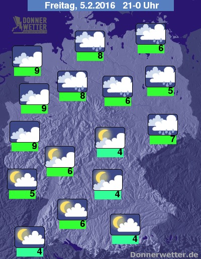 Heute Abend fällt im Norden und Osten unter dichter Bewölkung zeitweise Regen oder Sprühregen. Im Süden ist es meist nur locker bewölkt und ebenso trocken wie im Westen des Landes, wo jedoch oft dichte Wolken durchziehen. Die Abendtemperatur liegt bei 9 Grad am Niederrhein und etwa 4 Grad in Unterfranken.