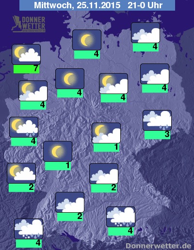 Heute Abend bleibt die Bewölkung im Süden und Osten der Republik weitgehend dicht, dazu fällt hier gebietsweise Regen, Schneeregen oder Schnee, teils besteht Glättegefahr! Weiter nach Nordwesten hin zeigt sich der Himmel oft locker bewölkt oder sternenklar, es können jedoch auch dichte Wolken durchziehen, dazu fällt aber nur selten etwas Regen. Die Abendtemperatur liegt bei 7 Grad in Ostfriesland und 1 Grad im Vogtland. An der Nordsee weht ein oft starker Wind.