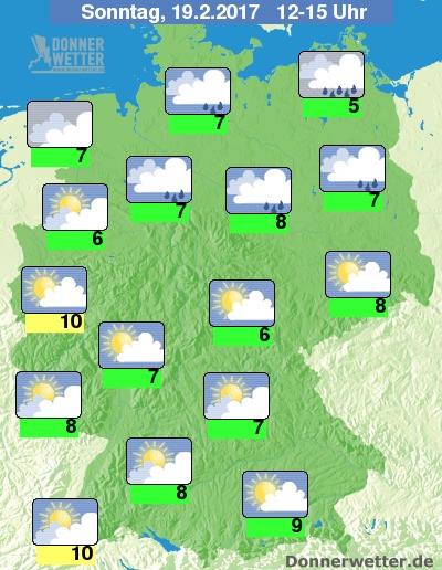 Heute Nachmittag ist es über der Südhälfte des Landes noch verbreitet heiter bis sonnig und dazu trocken, im Norden ziehen dagegen dichte Wolken durch und es fällt zeitweise Regen. Die Temperatur liegt bei 5 Grad in Rostock und bis 10 Grad im Rheinland.