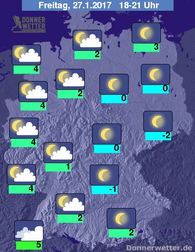 Heute Abend zeigt sich der Himmel über der Osthälfte Deutschlands verbreitet sternenklar. Weiter nach Westen ziehen dagegen meist lockere, hier und da auch mal mehr Wolken durch, jedoch bleibt es im ganzen Land trocken. Die Abendwerte liegen bei -2 Grad in der Lausitz und um 5 Grad in Freiburg.