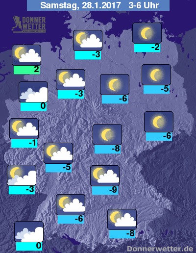 In der Nacht zum Samstag bleibt es von Sachsen, über Brandenburg bis nach Mecklenburg-Vorpommern bei einem sternenklarem Himmel. Im übrigen Bundesgebiet ist es teils locker, teils aufgelockert bewölkt. Im Westen und Südwesten auch gebietsweise stark bewölkt. Es bleibt bundesweit trocken bei Werten von 2 Grad an der Nordsee und bis -9 Grad in Mittelfranken.