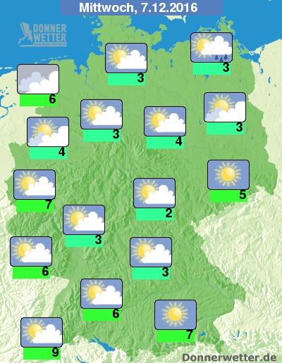 Am Mittwoch kommen im Norden und hierbei vor allem im Küstenumfeld von Nord- und Ostsee dichte Wolken auf, die hier auch etwas Regen bringen können. Im übrigen Bundesgebiet ist es dagegen meist heiter bis aufgelockert bewölkt, über Sachsen und Bayern sogar meist sonnig, dabei bleibt es trocken. Die Temperatur steigt auf 2 bis 9 Grad.