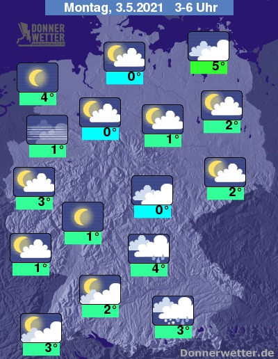 In der folgenden Nacht fällt im Alpenvorland unter kompakten Wolken noch oft Regen, teils auch Schneeregen oder Schnee. Im übrigen Bundesgebiet ist es noch hier und da stärker bewölkt, es lockert und klart aber größtenteils auf, dazu bleibt es trocken. Die Temperatur sinkt auf 5 Grad in Neubrandenburg und bis 0 Grad in Jena.