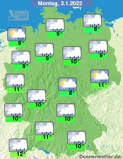 Am Montag ziehen weitgehend dichte Wolken durch, dabei zieht im Tagesverlauf von Westen her neuer Regen durch. Die Temperatur steigt auf 8 Grad in Erfurt und bis 12 Grad in Freiburg. An den Küsten weht noch ein oft stürmischer Wind.