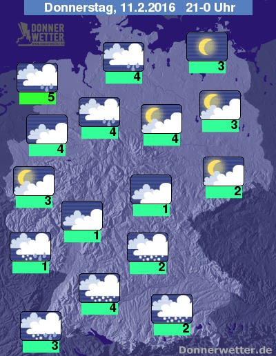 Heute Abend zeigt sich der Himmel oft stark bewölkt, vor allem über der Nordhälfte lockert es aber auch immer wieder mal auf, hier fällt nur gelegentlich auch Regen. Im Süden fällt dagegen, vor allem im Stau der Alpen zeitweise Regen, Schneeregen oder Schnee, dabei besteht erhöhte Glättegefahr! Die Abendtemperatur liegt bei 5 Grad in Emden und um 1 Grad in Jena.
