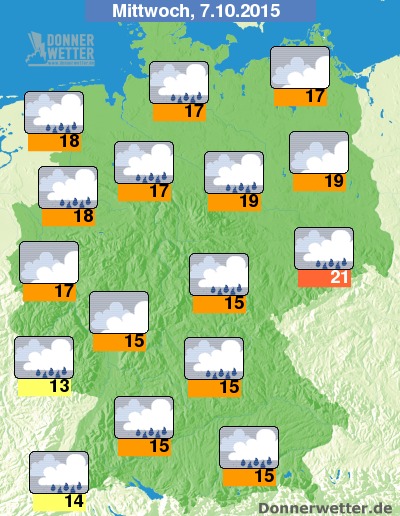 Am Mittwoch bleibt der Himmel über der Bundesrepublik weitgehend bedeckt, dabei fällt vor allem in einem breiten Streifen von Bayern, über Thüringen, Niedersachsen bis nach Schleswig-Holstein hinein oft langanhaltender und auch kräftiger Regen. In den anderen Landesteilen bleibt es hingegen oft trocken oder es regnet nur gelegentlich. Auflockerungen sind hier aber dennoch eher selten. Die Temperatur steigt auf 13 Grad am Pfälzer Wald und bis 21 Grad in Dresden.