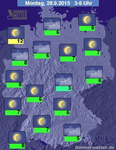 In der folgenden Nacht zeigt sich der Himmel verbreitet wolkenfrei, dabei bleibt es natürlich trocken. Stellenweise kann sich jedoch Nebel oder Hochnebel ausbilden. Die Temperatur sinkt auf 12 Grad an der Nordsee und bis kalte 3 Grad im Vogtland. Örtlich besteht dabei die Gefahr durch Rauhreifbildung!