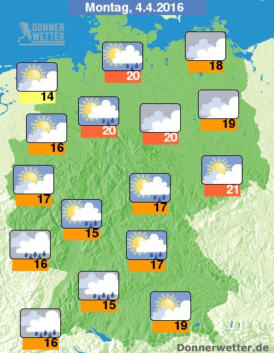 Am Montag ist es teilweise locker oder aufgelockert bewölkt und dabei trocken, oft ziehen aber auch dichte Wolken durch, die gebietsweise Regen oder einzelne Schauer bringen. Die Temperatur steigt auf 14 Grad an der Nordseeküste und bis 21 Grad an der Neiße.