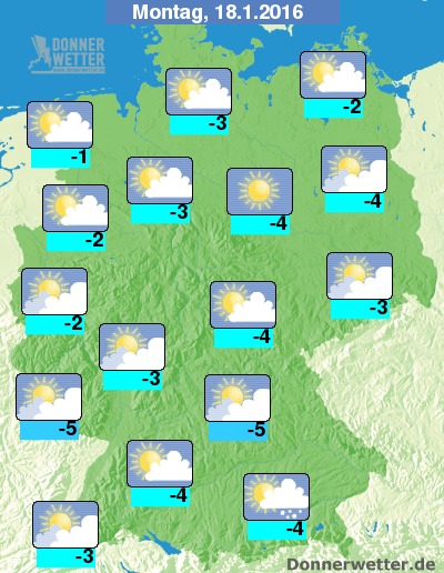 Am Montag sind nur am Alpenrand anfangs noch letzte Schneefälle möglich, sonst ist es in weiten Landesteilen heiter oder aufgelockert bewölkt, zum Teil wird es sogar sonnig. Vor allem im Alpenvorland können sich aber auch dichte Wolken halten, dazu bleibt es aber trocken. Die Temperatur steigt auf -5 Grad am Pfälzer Wald und bis -1 Grad an der Nordsee.
