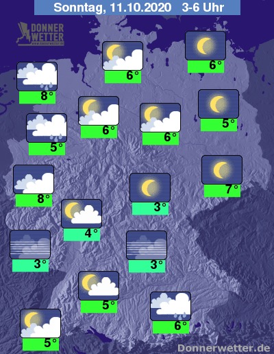 In der Nacht zum Sonntag zeigt sich der Himmel über dem Land verbreitet sternenklar oder nur locker bewölkt. Dichte Wolken ziehen jedoch besonders über den Nordwesten, teils auch über den Norden und Westen hinweg, dabei ist gebietsweise auch Regen möglich, sonst bleibt es trocken. Die Temperatur sinkt auf 8 Grad in Düsseldorf und bis 3 Grad in Nürnberg.