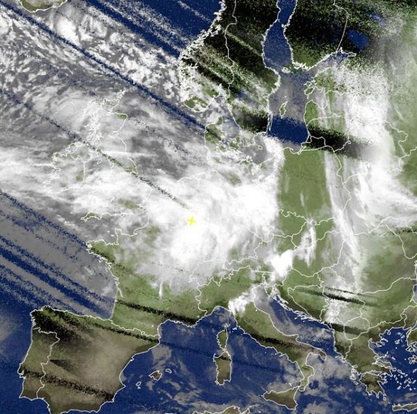 Das Satellitenfoto von heute Morgen zeigt die verbreitet dichte Bewölkung der Ausläufer von Sturmtief "Michel" westlich vor Skandinavien. Unter den sehr kompakten Wolken herrscht verbreitet sehr nasses, jedoch oft mildes Herbstwetter. Zudem herrscht vor allem rund um die Nordseeküsten, aber auch an den Küsten der Britischen Inseln und entlang der französischen Atlantikküste zum Teil schwerer Sturm oder sogar Orkan.