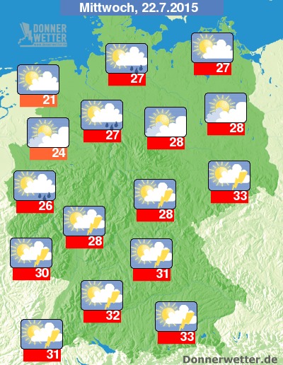 Am Mittwoch scheint besonders am Vormittag neben meist nur lockeren Wolken die Sonne und es ist überwiegend trocken. Nur im Westen und Südwesten sind schon vereinzelte Schauer und Gewitter möglich. Am Nachmittag ziehen dann häufig dichte Quellwolken auf und es bilden sich gebietsweise Schauer und regional schwere Gewitter. Im Norden bleibt es jedoch zum Großteil trocken. Die Temperatur steigt auf angenehme 21 Grad an der Nordsee und bis auf schwülheiße 33 Grad in Chemnitz.