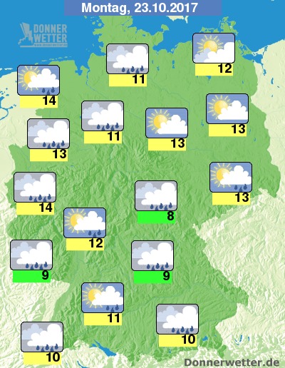 Am Montag zeigt sich das Wetter vom Nordosten bis ins nördliche Sachsen verbreitet heiter und dazu trocken. Im großen Rest der Republik ziehen dagegen mehrheitlich dichte Wolken durch und es fällt zeitweise Regen. Die Temperatur steigt auf kühle 8 Grad am Thüringer Wald und bis 14 Grad im Rheinland.