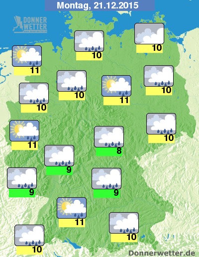 Am Montag ist es anfangs nur im Südosten und Nordwesten weitgehend trocken und teils auch mal aufgelockert bewölkt, sonst bleibt es jedoch erstmal dicht bewölkt und es fällt auch immer wieder Regen. Im Tagesverlauf regnet es dann auch im Südosten, während die Bewölkung im Norden und Westen des Landes hier und da auflockert und es trocken bleibt. Gegen Abend klingen auch die Niederschläge im Süden und Osten weitgehend ab und es sind Auflockerungen möglich. Die Temperatur steigt auf 8 Grad in Oberfranken und bis 11 Grad im Rheinland. Im Norden und Westen weht teils starker, an der Nordsee und auf den Bergen auch stürmischer Wind.