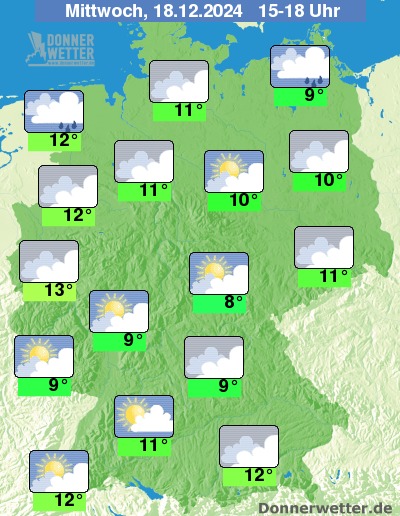 Am Mittwochnachmittag zeigt sich der Himmel zwischen dem Schwarzwald und dem Alprenrand wechselnd bis aufgelockert bewölkt, sonst dominiert verbreitet starke Bewölkung oder es ist bedeckt. Im Einzugsbereich der Küsten fällt am Nachmittag zeitweise etwas Regen, in den übrigen Landesteilen bleibt es meist niederschlagsfrei.