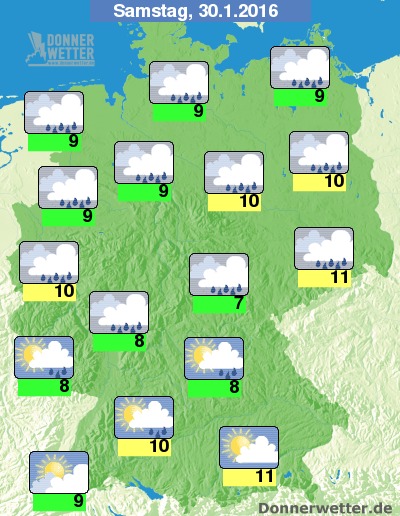 Am Samstag hängen verbreitet dichte Wolken über dem Land aus denen immer wieder, zum Teil kräftiger Regen fällt, Auflockerungen zeigen sich am ehesten im Süden, hier ist es auch teils längere Zeit trocken. Es werden 7 bis 11 Grad erwartet, dazu weht ein teils starker, an den Küsten und auf den Bergen auch ein teils stürmischer Wind.