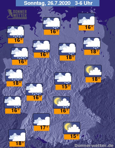 In der kommenden Nacht bleibt es im Süden und Osten zunächst trocken und anfangs noch oft aufgelockert bewökt. Sonst zieht jedoch verbreitet dichte Bewölkung durch und es fällt wiederholt, teils schauerartiger Regen. Zum Morgen hin erreicht der Regen auch den Osten, lediglich im Alpenvorland bleibt es weitgehend trocken. DIe Temperatur sinkt auf 18 Grad im Rheinland und bis etwa 15 Grad im Berchtesgadener Land.