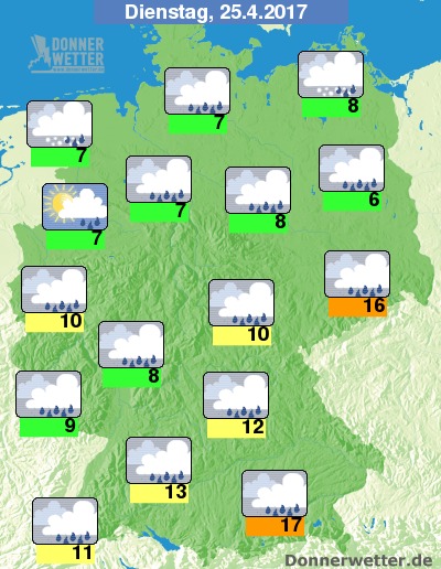 Am Donnerstag im Norden und Westen oft Sonnenschein, gebietsweise auch dichte Wolken und einzelne Schauer, selten Gewitter, sonst meist dichte Wolken und zeitweise Schauer, vereinzelt auch Gewitter, 5 bs 11 Grad.