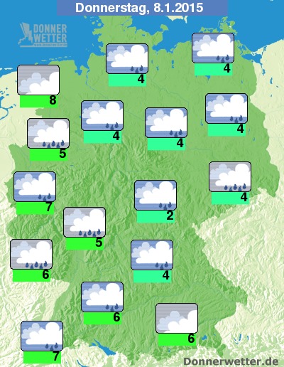 Am Donnerstag halten sich die Wolken weitgehend dicht und die Sonne bekommt praktisch keine Chance sich zu zeigen, statt dessen fällt immer wieder, zum Teil kräftiger und teils auch ergiebiger Regen. Im Süden des Landes bleibt es bis zum Nachmittag noch weitgehend trocken, spätestens am Abend zieht aber auch hier Regen auf. Die Temperatur steigt auf 2 Grad im Vogtland und bis zu 8 Grad an der Nordseeküste. Besonders am Nachmittag weht ein teils starker Wind.