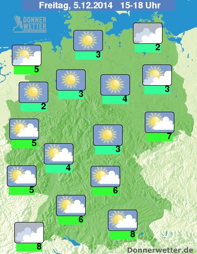 Heute Nachmittag bleibt es häufig stark bewölkt oder neblig-trüb, wenn sich im Norden der oft zähe Hochnebel auflösen kann, wird es dort meist heiter bis sonnig, nach Süden hin wird es, nach örtlicher Nebelauflösung, meist aufgelockert bewölkt sein. Im Nordosten kann es unter dichten Wolken noch vereinzelt etwas regnen, sonst bleibt es aber trocken. Die Temperatur steigt auf 2 Grad in Vorpommern und bis 8 Grad am Bodensee.