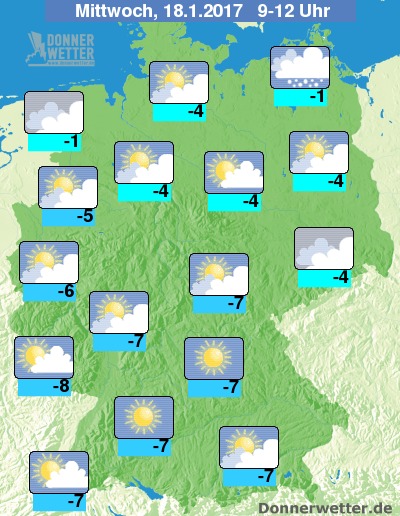 Am Vormittag zeigt sich das Wetter meist heiter über der Bundesrepublik. Im Nordosten an der Ostseeküste ist Schneefall möglich. Die Temperaturen liegen bei Werten um -1 Grad C bis -7 Grad C.