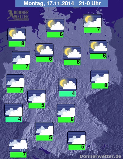 In der Nacht zum Dienstag zieht sich der Himmel auch in den übrigen Landesteilen meist zu, überwiegend aufgelockert oder stark bewölkt bleibt es in einem breiten Streifen vom Saarland bis hoch zur Nordsee. Es bleibt weitgehend trocken, vor allem am Alpenrand, im Südosten des Landes und gegen Morgen auch im Osten des Landes fällt jedoch zeitweise, meist leichter Regen. Nur vereinzelt kann sich Nebel oder Hochnebel bilden. Die Temperatur sinkt auf 8 Grad in Dresden und etwa 2 Grad in der Südeifel.