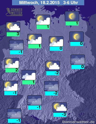 Am Mittwoch hält sich häufig noch, zum Teil zäher Nebel oder Hochnebel, da wo sich dieser auflösen kann, scheint jedoch verbreitet die Sonne. Besonders im Westen und Norden bestehen gute Chancen auf Sonnenschein. Es bleibt landesweit trocken. Die Höchstwerte erreichen 3 Grad in München und bis 8 Grad in Rostock.