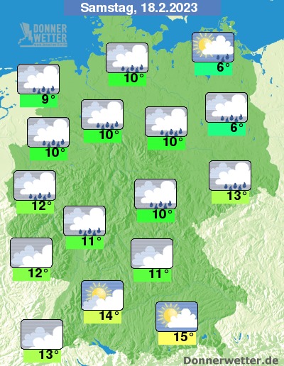 Am Samstag kann sich im Süden hier und da die Sonne zeigen, sonst bleibt es jedoch meist bei dichten Wolken und dazu fällt auch zeitweise Regen. Die Temperatur steigt auf kühle 6 Grad auf Rügen und bis auf frühlingshafte 15 Grad in München. Es weht weiterhin ein häufig starker und zum Teil auch stürmischer Wind.