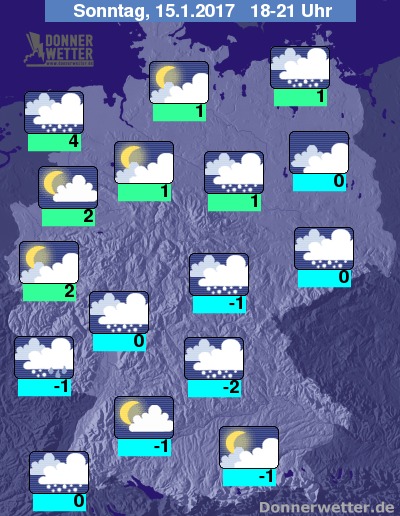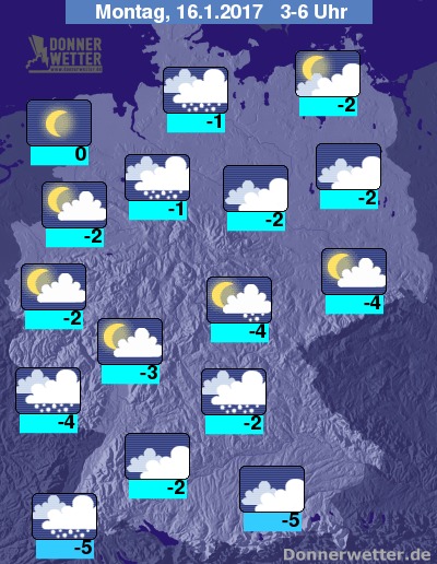 In der Nacht zum Montag ist es vor allem im Süden meist bedeckt bei gebietsweisem Schneefall. Sonst ist es teils stark, teils auch mal locker bewölkt und es sind einzelne Schneeschauer möglich. Dabei besteht die Gefahr vor Glatteis oder Schneeglätte! Die Temperatur sinkt auf 0 Grad an der Nordsee und bis -5 Grad im Raum München.