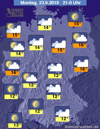 Am Abend lockern die Wolken im Großteil des Landes auf und es wird vor allem im Westen etwas freundlicher. Weiterhin sind Schauer vor allem im Nordwesten und Südosten möglich. Die Temperaturen liegen zwischen 13 Grad bei Augsburg und 22 Grad in Brandenburg.