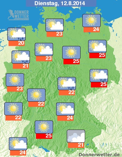 Der morgige Dienstag ist deutschlandweit als insgesamt freundlicher Sommertag anzusehen, vereinzelte Schauer sind im Emsland, im Süden Bayerns, sowie in Thüringen und Sachsen zwar möglich, ansonsten scheint bei meist nur lockeren Wolkenfeldern aber verbreitet die Sonne und es bleibt trocken. Die Temperaturen steigen auf 20 Grad in Ostfriesland und 25 Grad in Brandenburg.