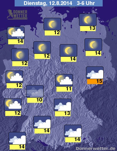 In der kommenden Nacht klart der Himmel vor allem in der Nordhälfte meist auf,meist stark bewölkt bleibt es dagegen im Süden des Landes sowie gebietsweise im Bereich des Nordseeumfeldes, hier ist auch vereinzelt etwas Regen möglich, sonst bleibt es aber weitgehend trocken. Die Temperatur sinkt auf 15 Grad in Chemnitz und frischen 10 Grad im Odenwald.