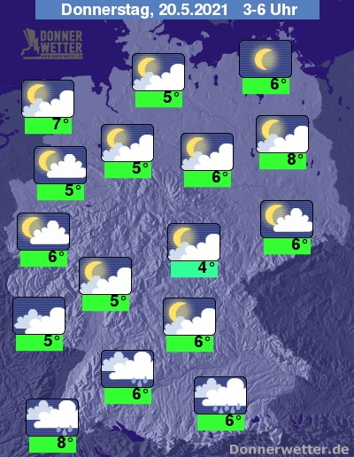In der bevorstehenden Nacht klingen letzte Schauer und vereinzelte Gewitter verbreitet ab und es lockert meist auf. Lediglich im Süden bleibt es weitgehend dicht bewölkt und es fällt vor allem Richtung Alpen zeitweise Regen. Die Temperatur sinkt auf 8 Grad im Oberrheingraben und bis 4 Grad im Grabfeld.