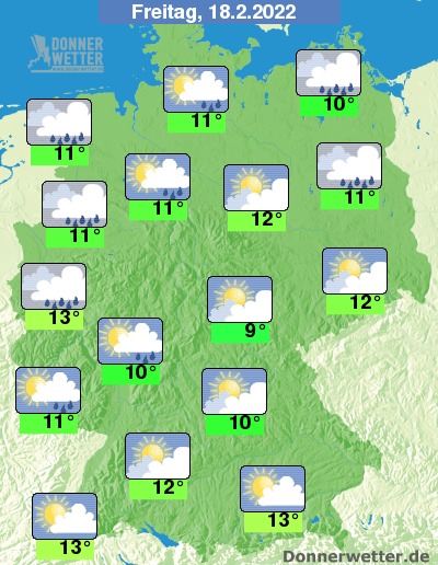 Am Freitag ist es im Süden oft heiter, sonst ziehen jedoch meist dichte Wolken durch, Auflockerungen sind immerhin möglich. Über der Nordhälfte fällt vorübergehend etwas Regen, während es sonst größtenteils trocken bleibt. Die Temperatur erreicht 9 Grad in Erfurt und bis 13 Grad in Freiburg. Über der Nordhälfte weht ein teils stürmischer Wind, an der See herrscht streckenweise Sturm.
