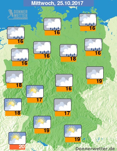 Am Mittwoch bleibt es über der Nordhälfte Deutschlands bedeckt und bevorzugt im Norden fällt zudem zeitweise Regen. Im übrigen Bundesgebiet ist es verbreitet aufgelockert bis stark bewölkt, dabei jedoch trocken. Die Temperatur steigt auf 16 bis 20 Grad.
