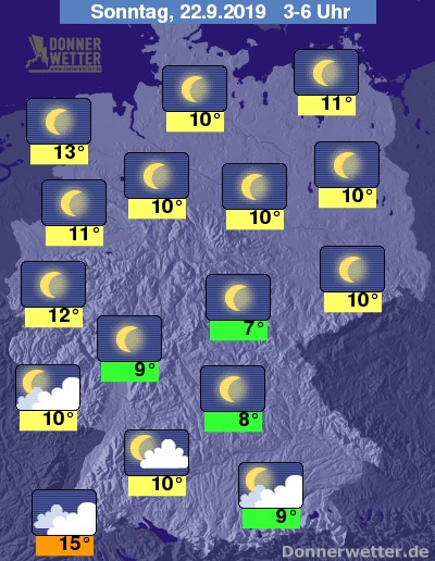 In der kommenden Nacht zeigt sich der Himmel anfangs landesweit sternenklar. Im Laufe der Nacht ziehen dann besonders im Südwesten, bis zum Morgen auch im Süden und Westen einige, zum Teil dichte Wolken auf, dazu bleibt es aber trocken. Die Temperatur sinkt auf 15 Grad im Breisgau und bis 7 Grad im Eichsfeld.